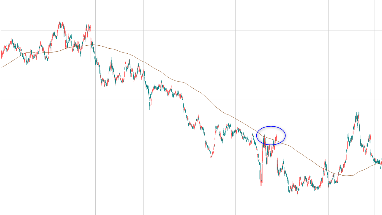 要するに移動平均線が「上値抵抗線(レジスタンスライン)」となり、再び下落に転じた形です。