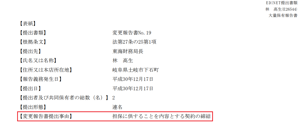 変更報告書の見方「当該株式を担保に差し入れる場合」
