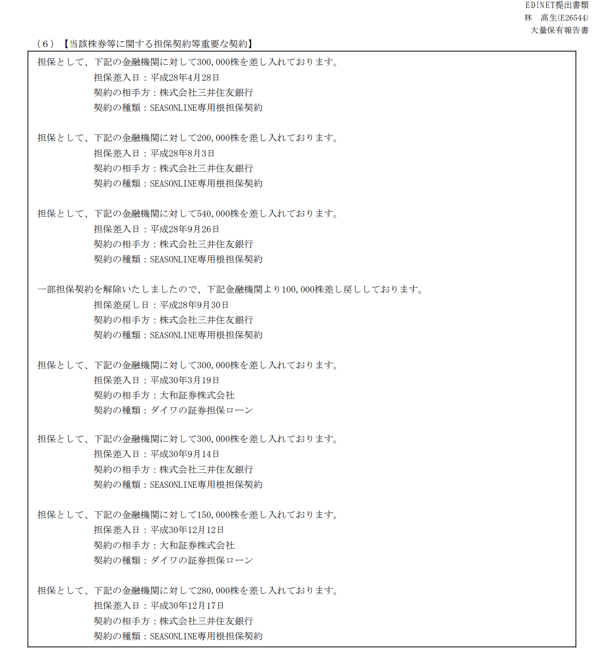 読み進めると、【当該株券等に関する担保契約等重要な契約】とあり、誰に対して何株の差し入れを行ったかの詳細が記されています。