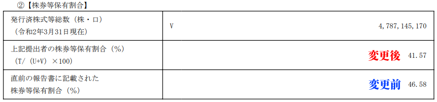 要点のみ抜粋したものですが、株券等保有割合が変更前の46.58%から41.57%に減少しているということがわかります。