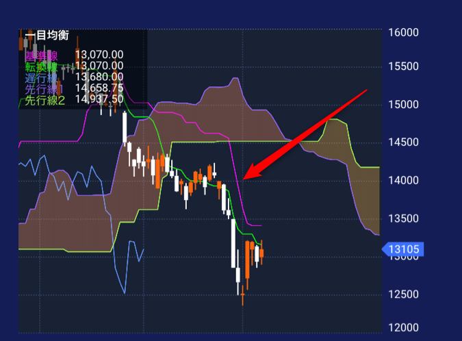反対に基準線が下向きの状態で、転換線が基準線の上から下に突き抜けるように交差する(デッドクロス)場合は、相場の「逆転」を意味しており、一般的に下落サインと言われています。