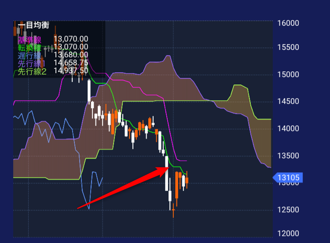 また、基準線と転換線が交差するところは、相場の転換点を表しています。