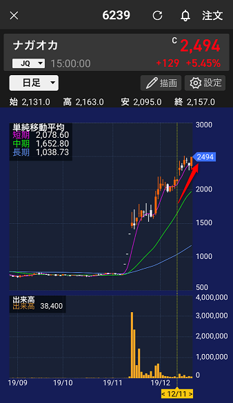 わかりやすい例として、【6239】ナガオカの株価で確認してみましょう。