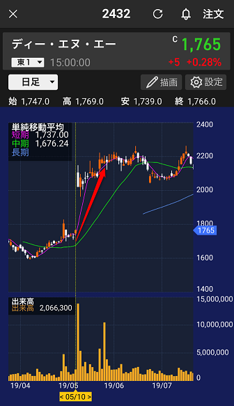 わかりやすい例として、2019年5月10日に大規模な自社株買いを発表した【2432】ディー・エヌ・エーの株価も確認していきましょう。