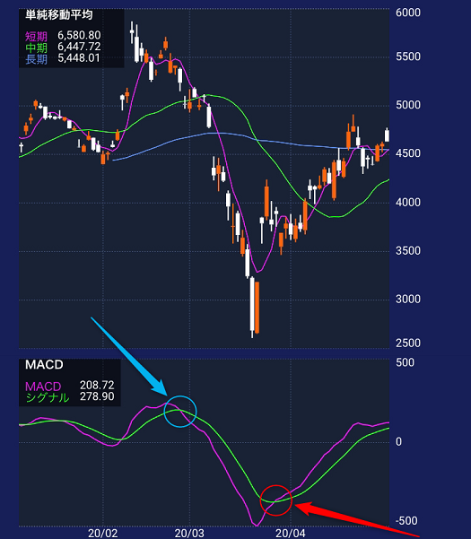 MACDは、実際の株価や単純移動平均線よりも先行して動く傾向があるため、売買サインも先行して発生するという特徴があります。