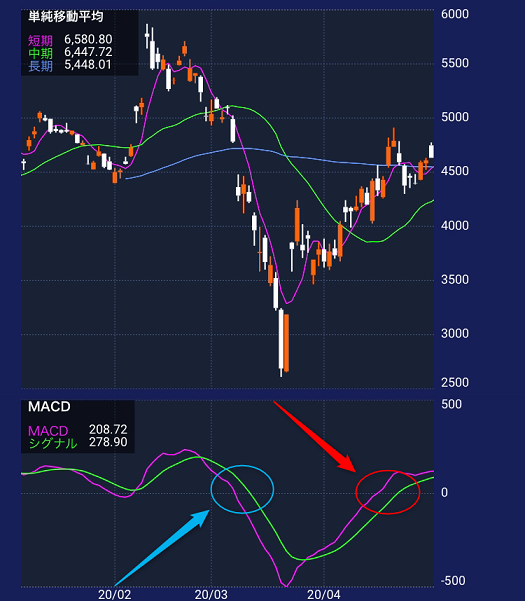 ゴールデンクロスやデッドクロスのあと、0ラインを超えると信頼度が増し、より強いトレンドという見方ができます。