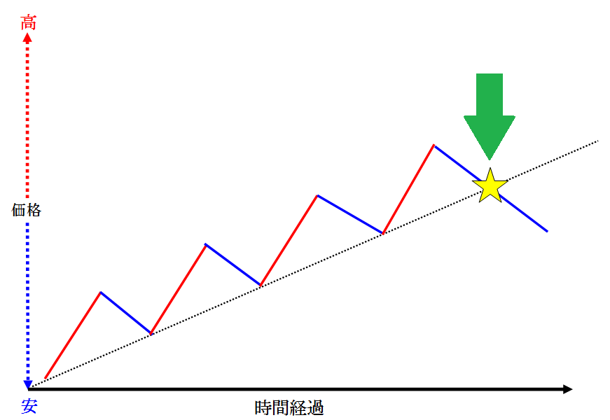 ですが、上記画像のように下抜けしてしまう場合は、そのまま下降トレンドへ転換してしまうこともあります。