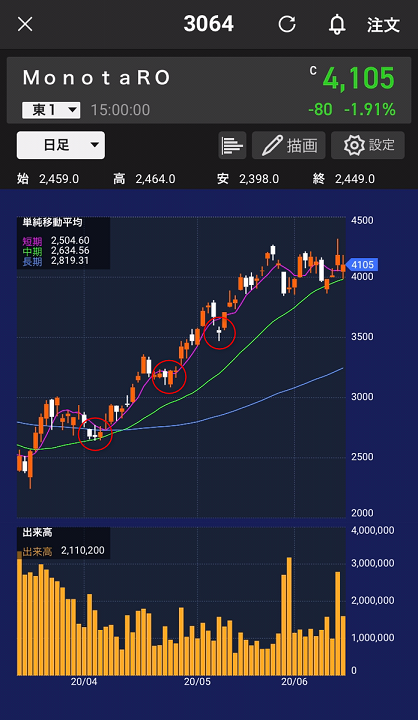 株価が上昇トレンドにある場合、株価は25日移動平均線の上に位置しており、一時的に下落しても25日移動平均線を割り込まず切り返すことが多いです。上記画像でいうと3箇所の赤丸のところです。