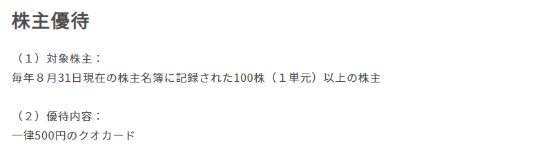 権利確定月は8月で、毎年8月31日現在、株主名簿に記載された株主が対象となり、100株以上保有で一律500円のクオカードが贈呈されます。