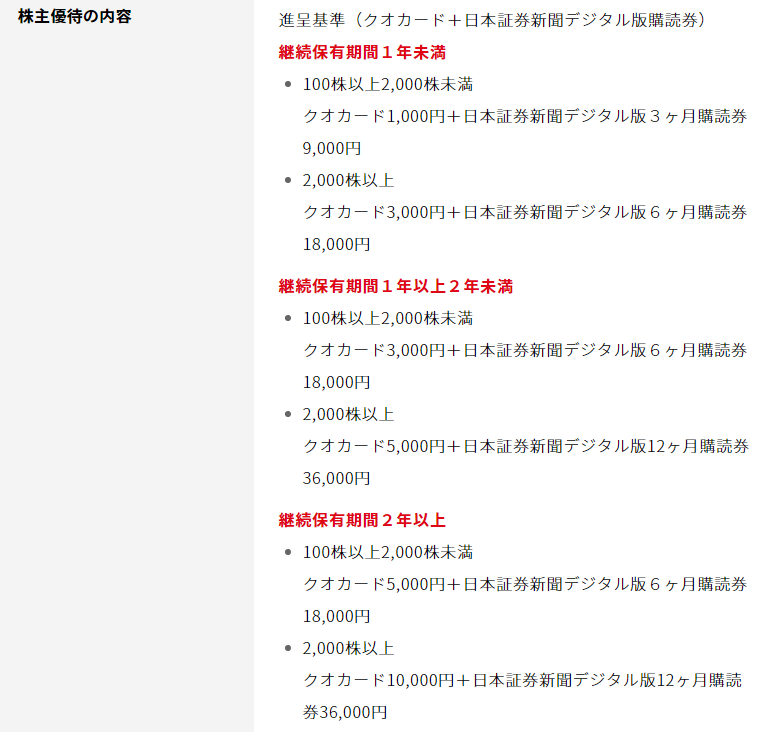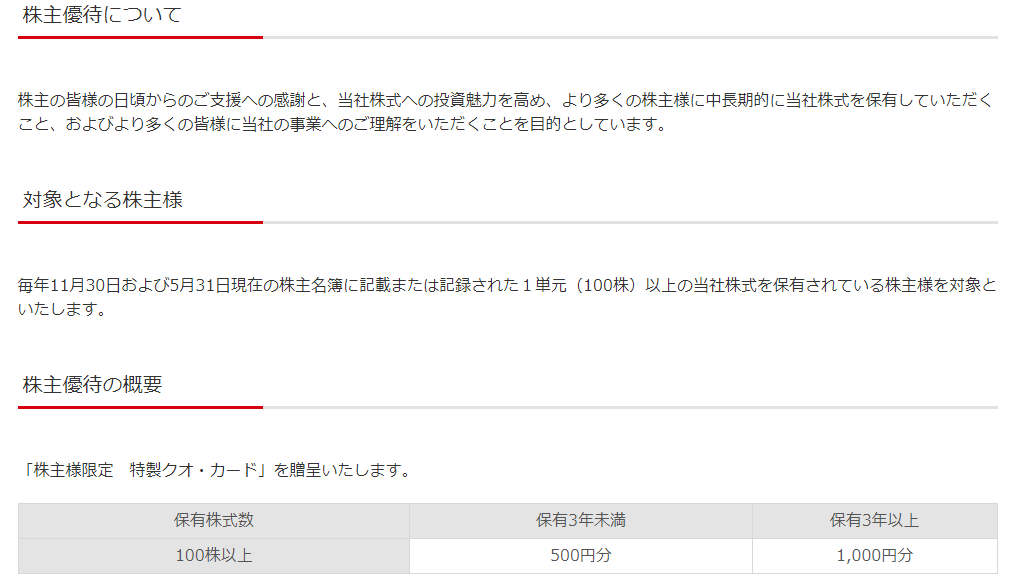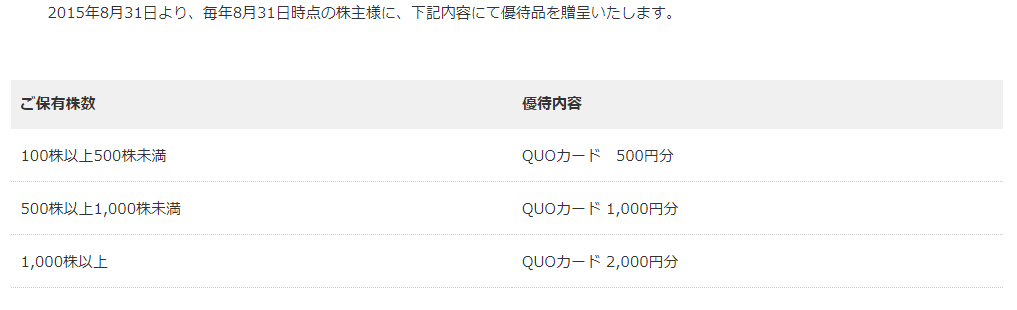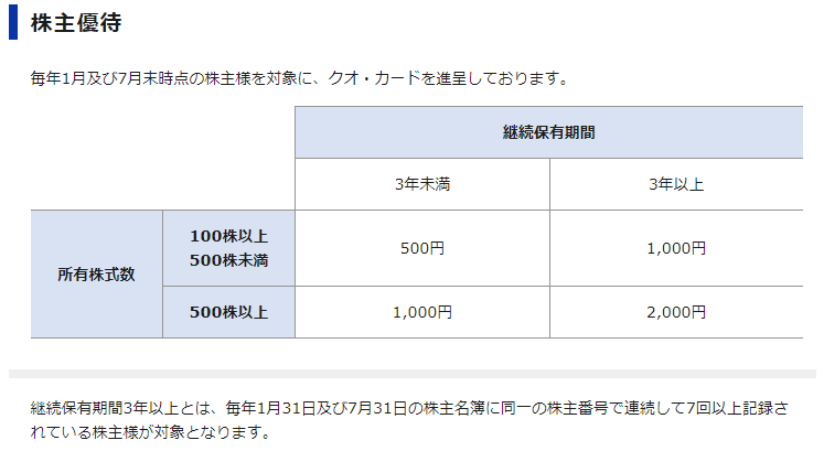 100株保有で保有期間に関係なく、500円分のクオカードが贈呈されます。