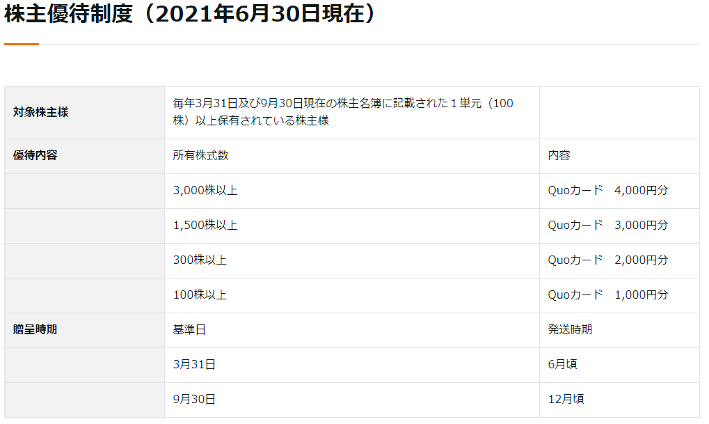 権利確定月は3月で、100株以上保有で一律1000円分のクオカードが贈呈されます。