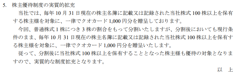 優待品が100株以上保有で一律1000円分のクオカードというのは従来と変わりありませんが、株式分割が普通株式1株につき3株の割合ということで、実質的拡充となっています。