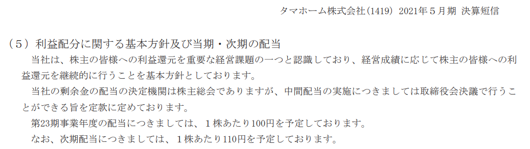 今期の年間配当を110円(前期比10円増)に増配する方針のタマホームですが、