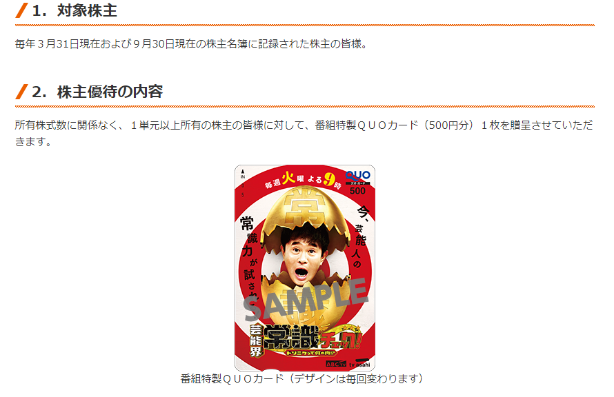 100株保有で、保有期間に関係なく、一律500円分の番組特製クオカードが贈呈されます。