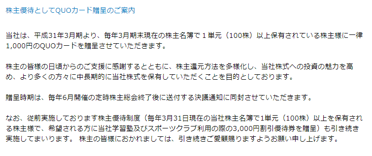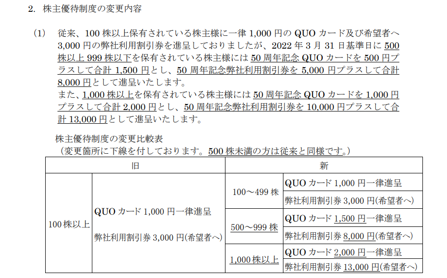 ただし、こちらは500株以上保有の株主が変更(拡充)の対象となっており、100株~499株保有の株主は先ほど触れた通り一律1000円分のクオカードと、希望者へ同社利用割引券3000円分となります。