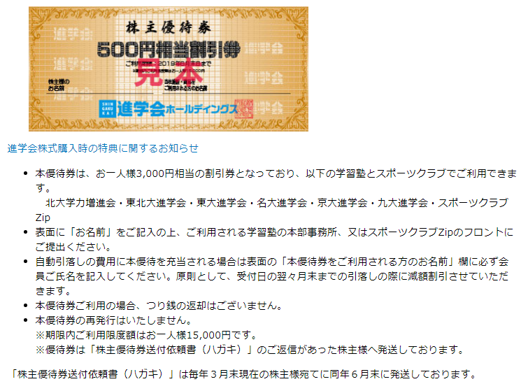 さらに、希望される株主には同社学習塾およびスポーツクラブの利用割引優待券が贈呈されます。