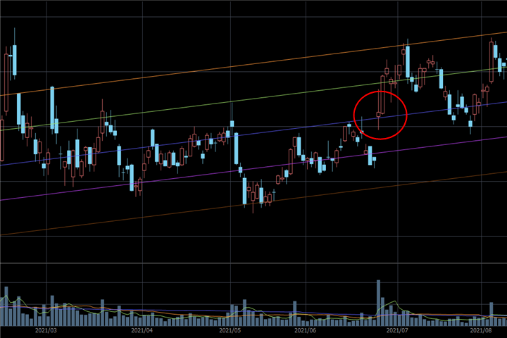 まず1つ目は「株価が中心線を上抜けた時」です。