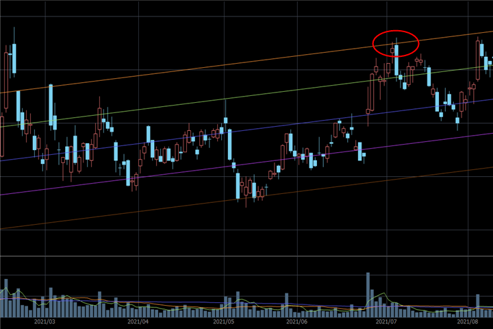 上値抵抗線とは、簡単に言うと売りが出やすく株価が伸び悩む傾向にあるラインのことです。