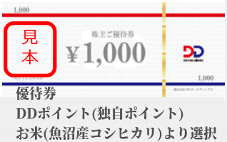 | 6,000株以上 | ・DD POINT36,000POINT、もしくは株主ご優待券36,000円、もしくはお米15kg |