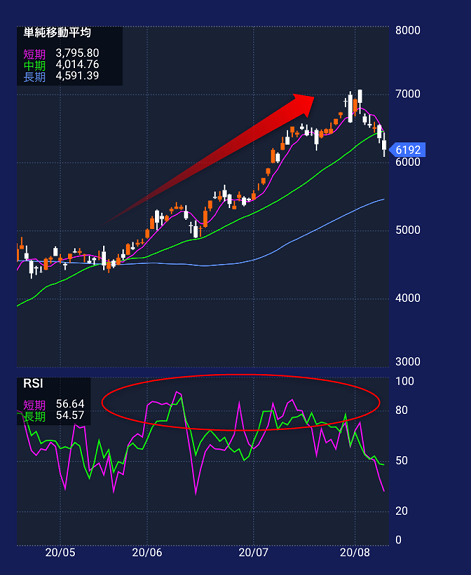 RSIは、強いトレンドや激しい値動きがある場合、うまく機能しないこともあります。そのため、RSIを使うときは株価チャートの値動きとあわせて確認していきます。