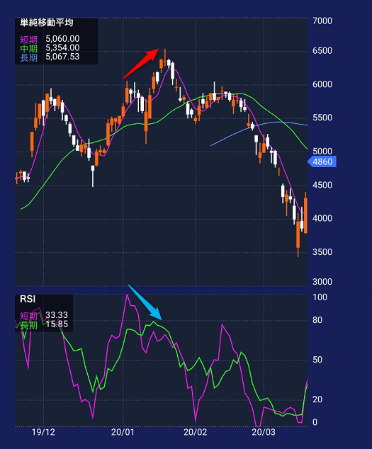 ダイバージェンスとは、実際の株価の動きとオシレーター系のテクニカル指標の動きが逆行する現象のことをいいます。