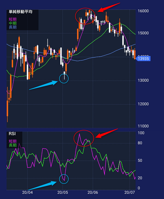 RSIは逆張りの目安として活用されるのが一般的で、「買われ過ぎ=売りサイン」「売られ過ぎ=買いサイン」と考えることができます。