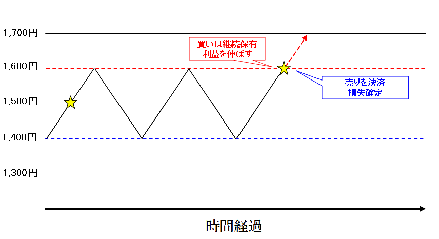 あらかじめ1,500円で両建てを行って、1,600円を抜けたら売りポジションを決済して損失を確定させ、買いポジションはそのまま継続保有して利益を伸ばしていくと手法です。