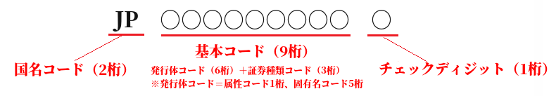 新証券コードは12桁の基本構成で、左から順に国名コード(アルファベットコード2桁)・基本コード(9桁)・チェックディジット(1桁)の仕様となっています。