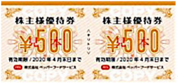 ▼優待利回り 0.54% ▼優待内容 「すき家」「なか卯」「ココス」など自社グループで使用できる株主様お食事ご優待券(500円券) ▼保有株数100株以上300株未満