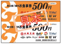 2,500円(500円券×5枚)相当のお食事ご優待券 ▼200株以上400株未満 5,000円(500円券×10枚)相当のお食事ご優待券 ▼400株以上 10,000円(500円券×20枚)相当のお食事ご優待券 ▼権利確定月 |
