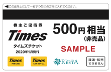 ▼優待利回り 1.26% ▼優待内容 全国の時間貸駐車場「タイムズパーキング」、自社グループのサービス「タイムズカーレンタル」、温浴施設「タイムズ スパ・レスタ(東京都豊島区東池袋)」で利用できるタイムズチケット ▼保有株数100株以上1,000株未満