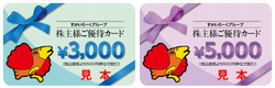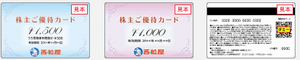 3,000円カード×1枚(×年2回) ▼300株~499株 3,000円カード×3枚(6月) 3,000円カード×2枚(12月) 5,000円カード×1枚(12月) ▼500株~999株 5,000円カード×3枚(6月) 3,000円カード×1枚(12月) 5,000円カード×3枚(12月) ▼1,000株以上 3,000円カード×1枚(6月) 5,000円カード×6枚(6月) 3,000円カード×2枚(12月) 5,000円カード×6枚(12月) ▼権利確定月 |