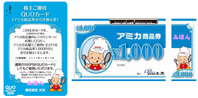 ▼保有株数100株以上 1枚(2,000円相当) ▼保有株数200株以上 2枚(4,000円相当) ▼保有株数400株以上 3枚(6,000円相当) ▼保有株数600株以上 4枚(8,000円相当) ▼保有株数800株以上 5枚(10,000円相当) ▼保有株数1,000株以上 6枚(12,000円相当) ▼保有株数3,000株以上 10枚(20,000円相当) ▼保有株数5,000株以上 15枚(30,000円相当) |