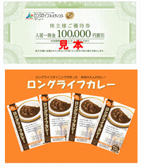 ▼優待利回り 157% ▼優待内容 ①割引優待券(グループ子会社日本ロングライフ株式会社直営の有料老人ホームおよびグループホームの入居一時金または入園金の金額から10万円を割引) ②ロングライフカレー(8箱) ※①は株主本人および2親等以内の親族入居時に適用 ※保有株数200株以上 ▼権利確定月 10月末 ▼最低投資金額目安 65,400円 |