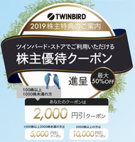 ▼優待利回り 4.5% ▼優待内容 自社運営ECサイト(ツインバード・ストア)で商品購入時に最大50%割引で利用できる株主優待クーポン ▼権利確定月 2月末 ▼最低投資金額目安 44,300円 |