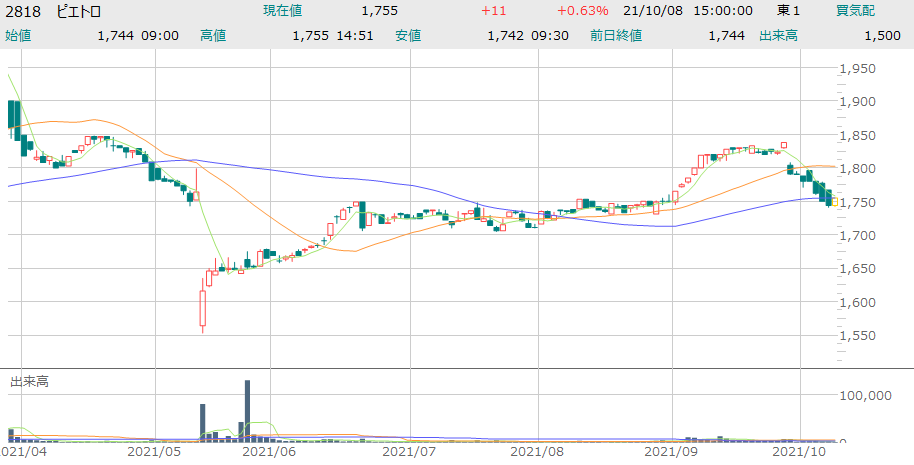 2021年10月8日時点で株価は1,755円ですので、100株取得の最低投資金額は175,500円となります。