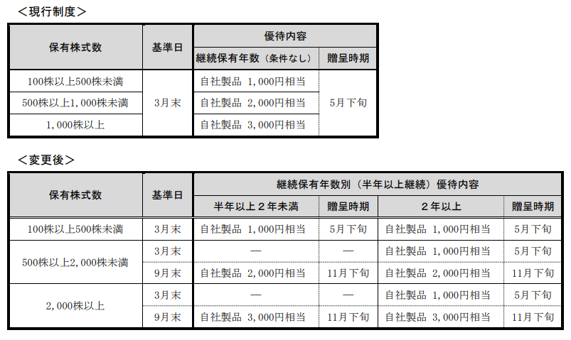 2021年8月2日付の開示「株主優待制度の変更に関するお知らせ」で、2022年3月31日現在の株主名簿に記載される分より変更となりますが、100株保有の場合は特に変更はありません。