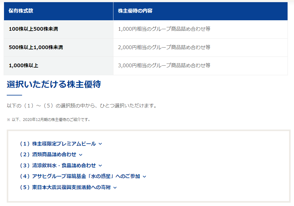 権利確定月は12月で、100株保有で株主限定ビールなど、選択式になります。