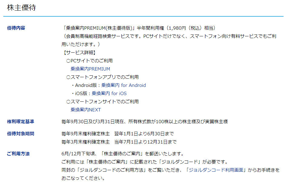 権利確定月は3月と9月で、100株保有で、ジョルダンが運営する「乗換案内PREMIUM(株主優待版)」の半年間利用権となります。