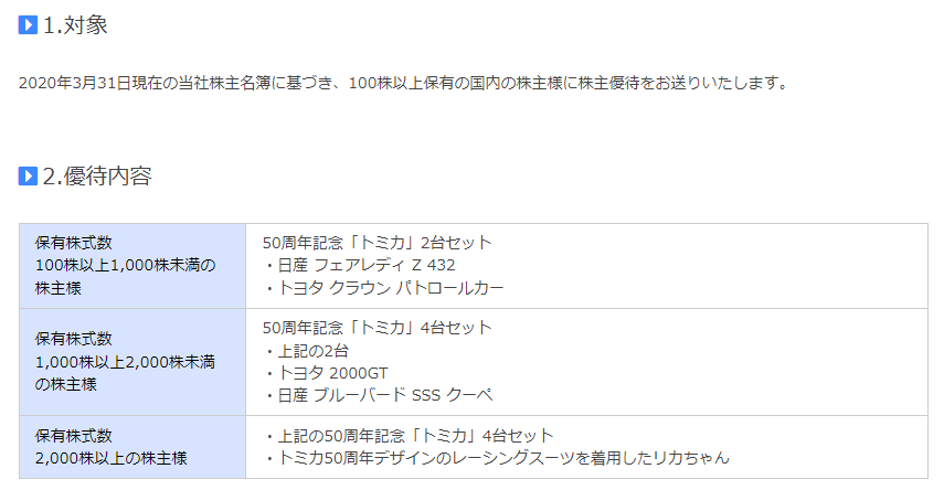 また、タカラトミーの商品を最大40%割引で購入できる株主割引制度もあり、こちらは100株保有継続1年未満で10%割引、保有継続1年以上で30%割引、3年以上で40%割引となっています。