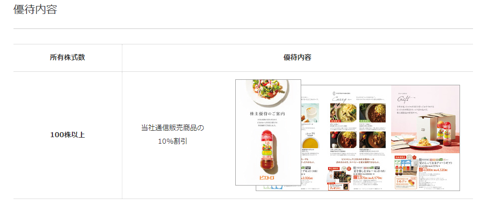 ほか、100株保有で通信販売での優待割引が年2回となり、ピエトロ社通信販売商品10%割引となっています。