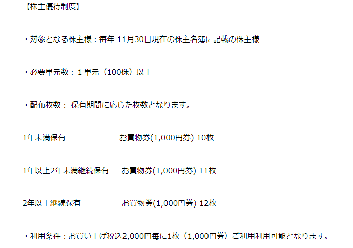 ・100株以上保有、継続保有1年未満でお買物券1000円券が10枚