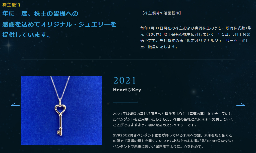 権利確定月は1月で、100株保有で3,000円相当の株主限定オリジナルジュエリーが贈呈されます。