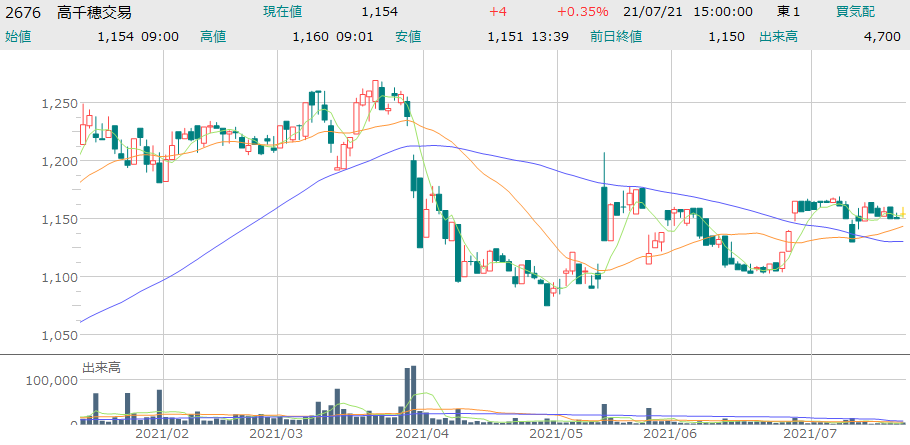 2021年7月21日時点で株価は1154円ですので、100株取得の最低投資金額は115,400円となります。