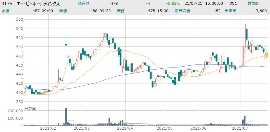 2021年7月21日時点で株価は478円ですので、100株取得の最低投資金額は47,800円となります。