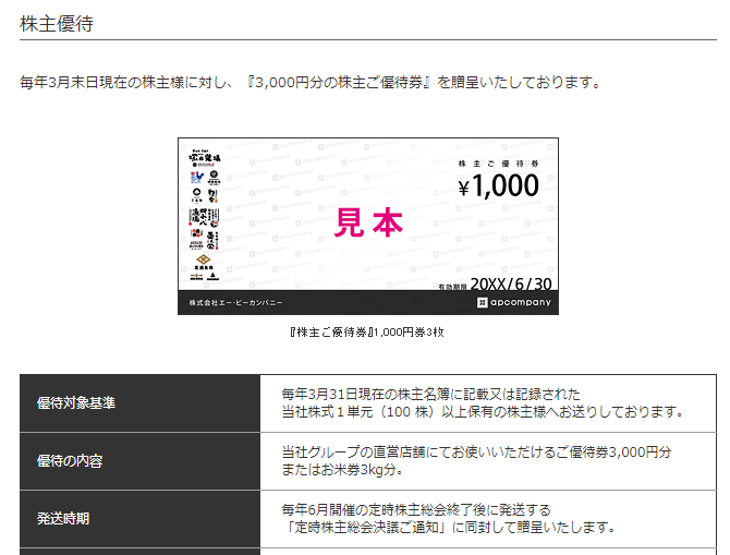 100株保有で「APHDグループの直営店舗で使用できる優待券3000円分」または「お米券3キロ分」が贈呈されます。