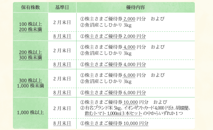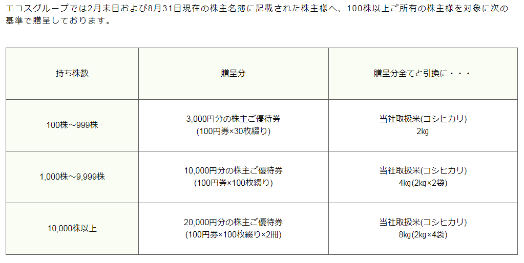 100株保有で「3000円分の株主優待券」または「3000円分の引換券全てと引き換えにエコスグループ取扱米のコシヒカリ」が贈呈されます。