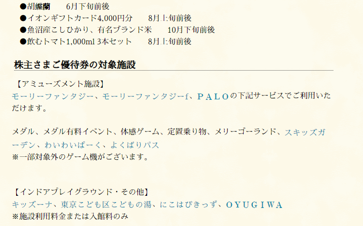優待券の対象施設はアミューズメント施設やインドアプレイグラウンドがあり、株主優待券での品物はイオンファンタジーのHP上でお届け目安時期を確認することができます。