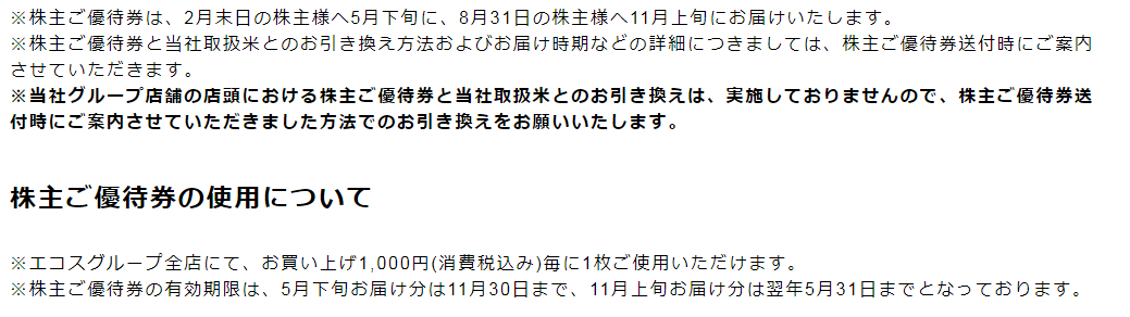 ちなみに株主優待券は、エコスグループ全店にて、お買い上げ税込み1000円ごとに1枚使用することができます。
