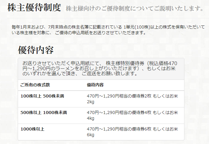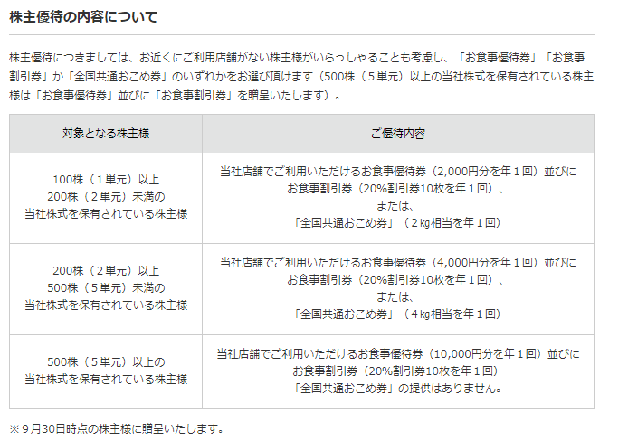 100株保有で「同社店舗で利用できる2000円分のお食事優待券」と「お食事割引券20%割引券10枚」または「全国共通おこめ券2キロ相当分」が贈呈されます。